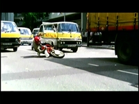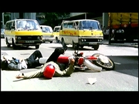 停車中の車の間をすり抜けていた際に、停車していた車両(キャラバン)のドアが開き、バイクは激突、転倒してしまう。