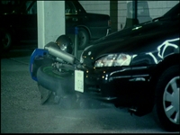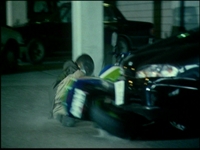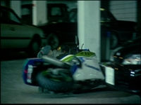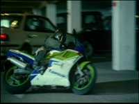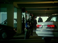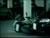 一般車両(コロナ)がバイクに驚きスピン、避けようとしたバイクは転倒、停まっていた車(サイノス)に衝突して停まる。