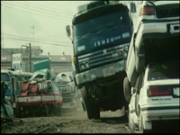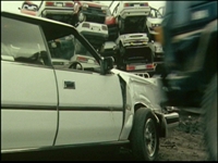 廃車処理場に突入したダンプトラックは、停まっていた車(クラウン)に衝突した後、廃車の山を台にして、横転してしまう。