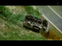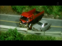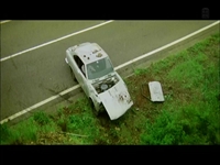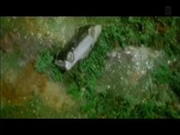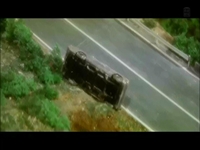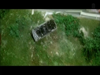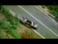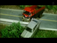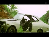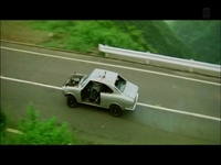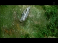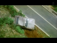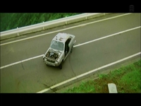 急ハンドルを切った車は、ガードレールを突き破り、崖下に転落してしまうが、無事に着地、逃げ切ることに成功する。